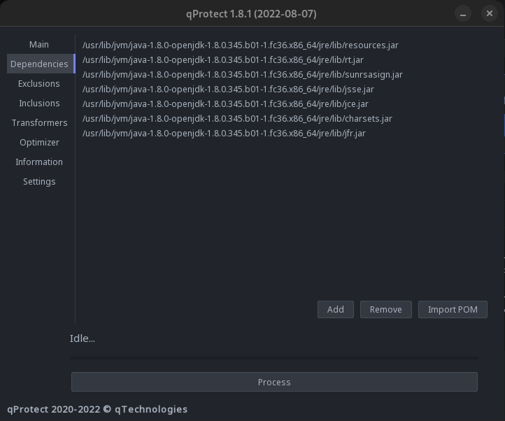 > The following tab is for dependencies of your project, these are the dependencies your project is using. These dependencies need to be added to qProtect aswell, otherwise obfuscation will fail.